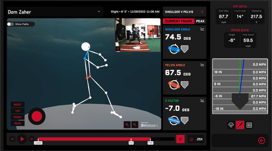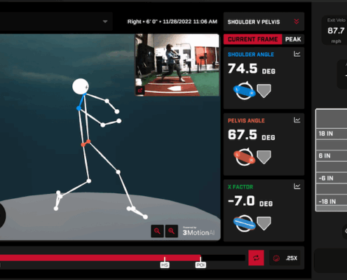 At The Capstone Athletics, HitTrax Biomechanics combines high-speed video with advanced batted-ball data to deliver deeper, more accurate insights into an athlete’s kinetic sequence. Powered by 3MotionAI, this technology tracks key metrics such as angular velocities of the pelvis, shoulders, and arm, along with stride length, center of mass, and much more. It’s a powerful tool for understanding movement patterns, optimizing mechanics, and unlocking peak performance.