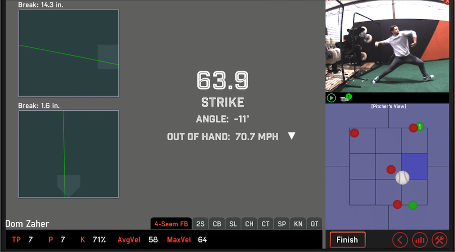 Measures pitch movement, spin rate, release data, ball flight, and strike-zone accuracy